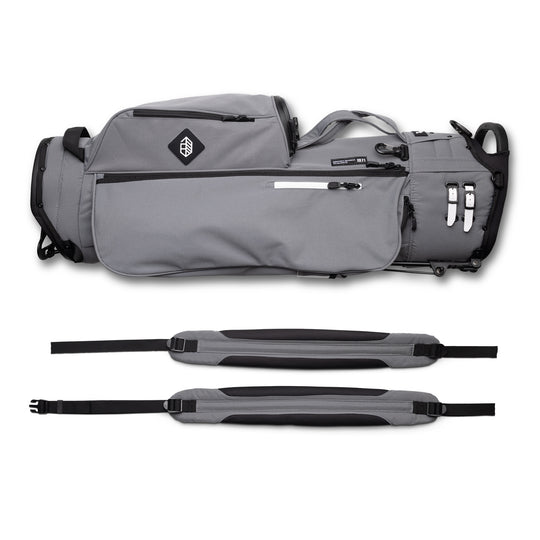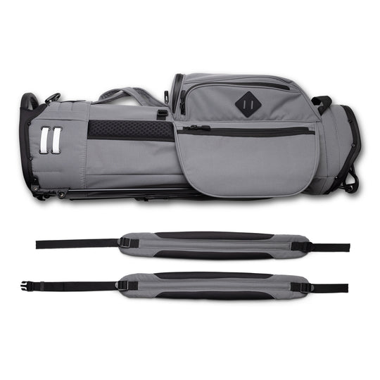 Designed with a versatile single or double shoulder strap configuration the Trouper 3.0 is your ideal companion on the course. A large insulated front cooler pocket has enough space to keep four 16oz cans cold. The two newly improved fleece-lined valuable compartments and seven-pocket design secures valuables while allowing for straightforward access. A large five-way divider allows for simple organization and an easy pull for all 14 clubs even with oversized grips. Simply put the Trouper 3.0 delivers an effortless and reliable experience for any player round after round. Featuring All-New Straps and a bolstered stand mechanism.